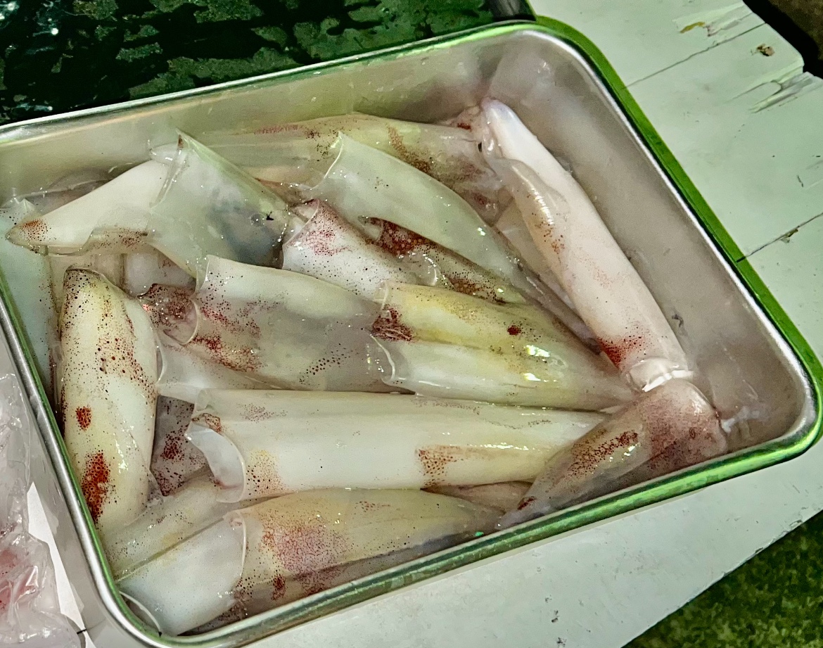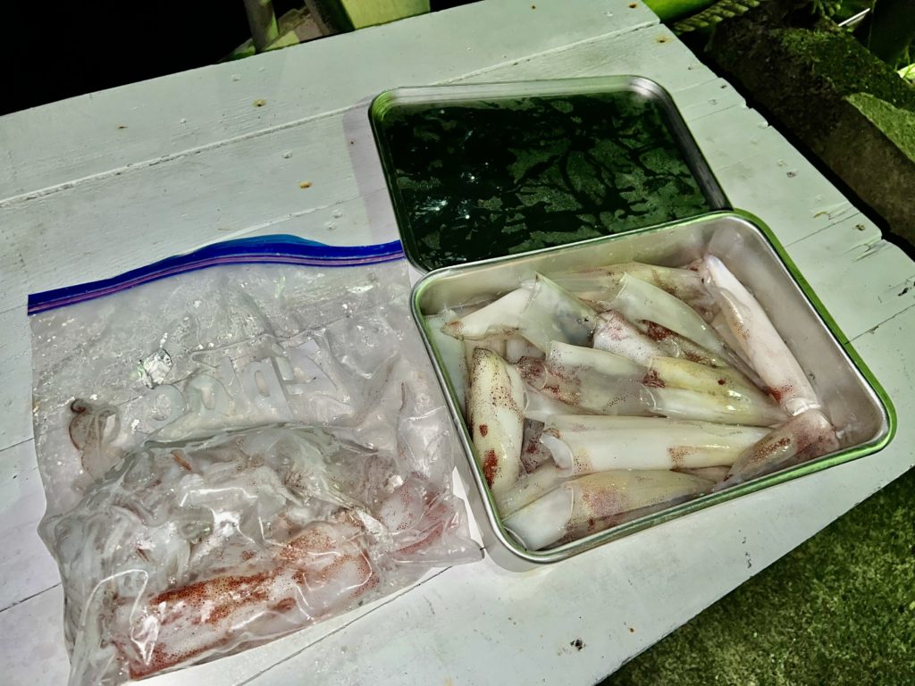 いけすの中で死んでしまったイカと、生きていたイカを分けて、墨を抜いてワタも出してありました。