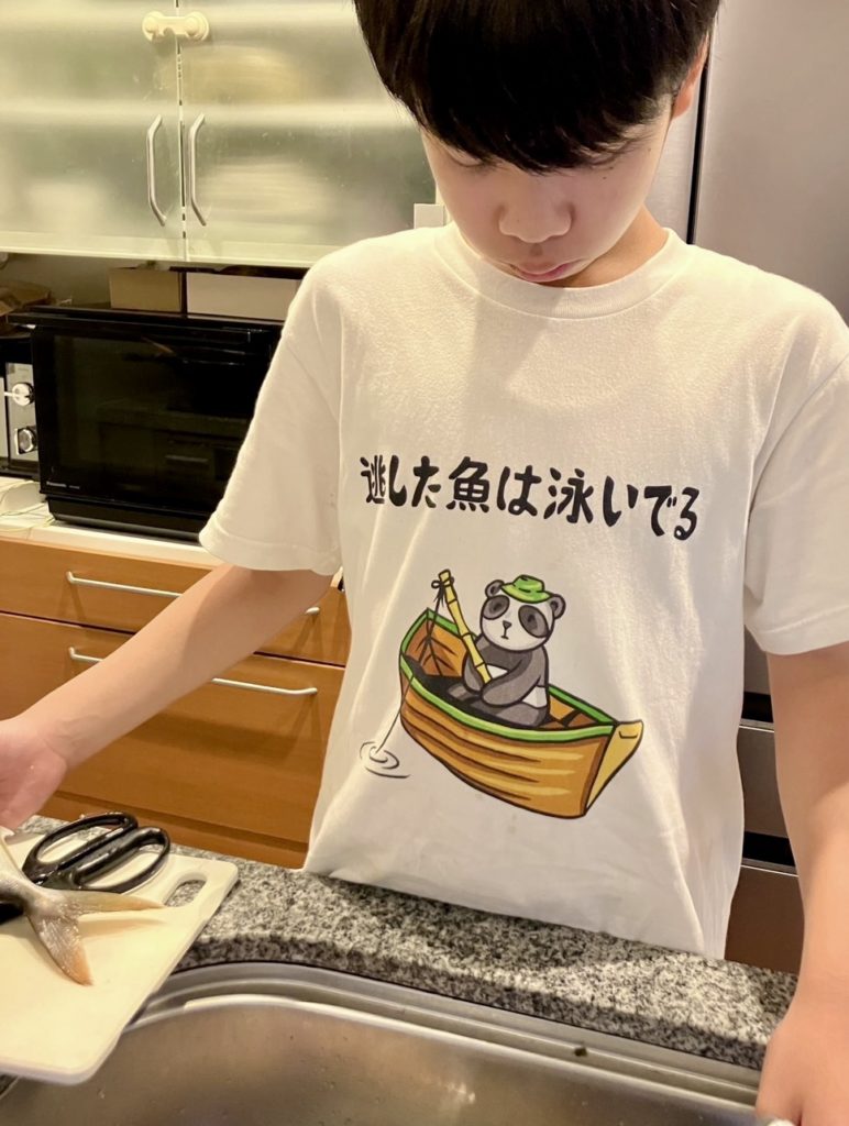 小学校4年生のころ初めてうちに来てくださり、その後ほぼ毎月午後の3時間アジ釣りにきてくださっているうちに、自分で釣って自分でお魚を上手にさばけるすてきな男の子に!