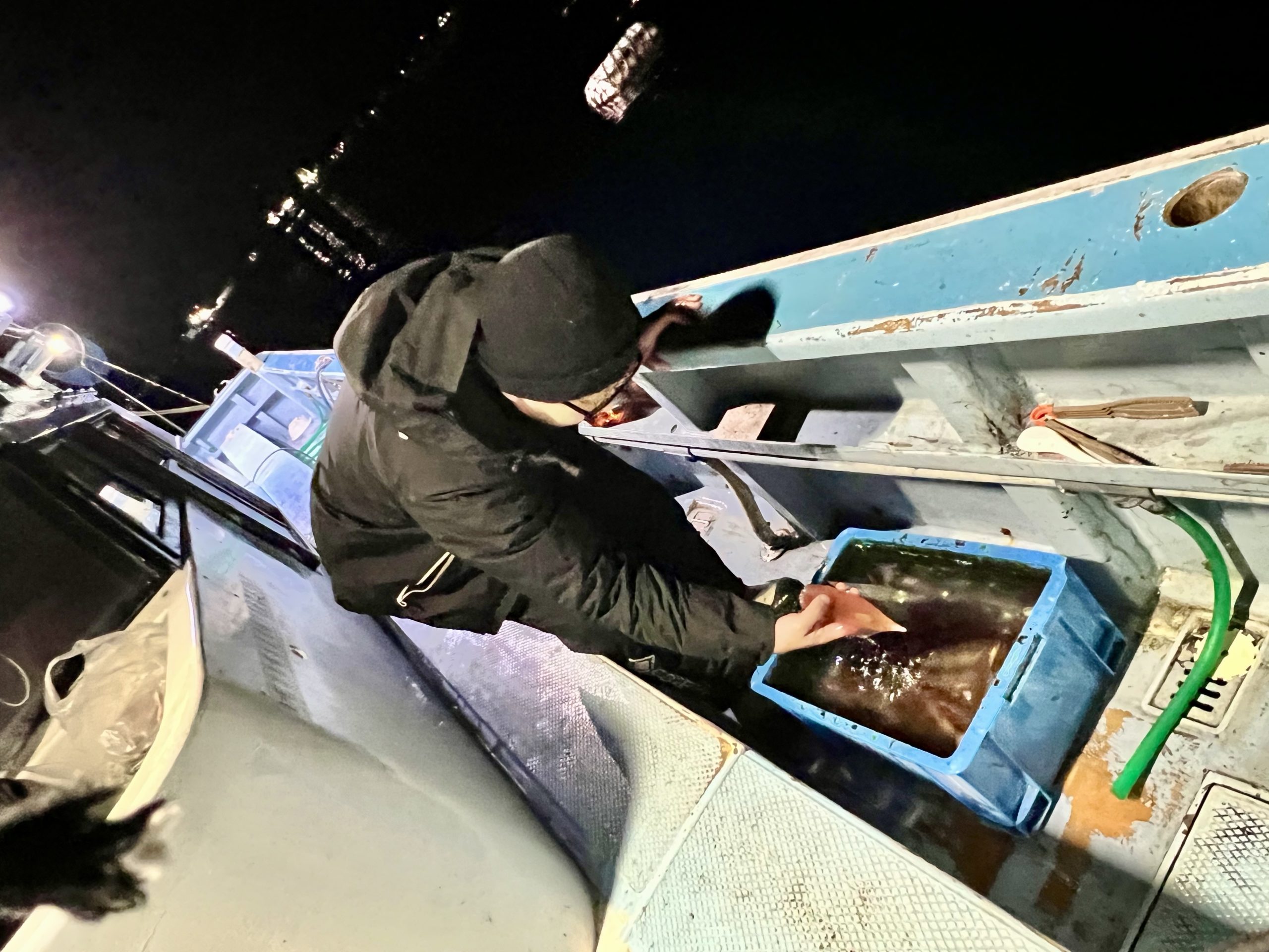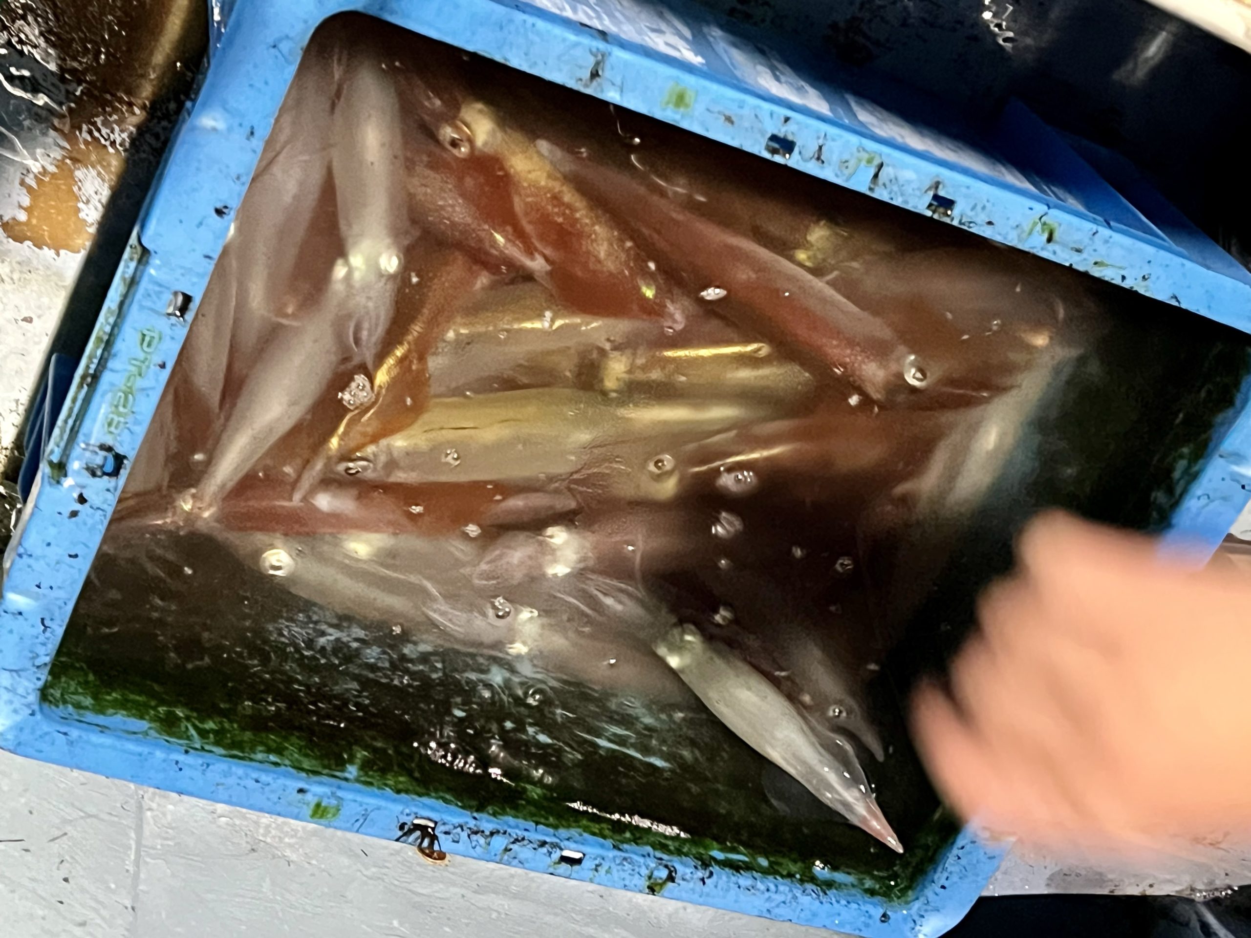 イケスからイカ箱に移します